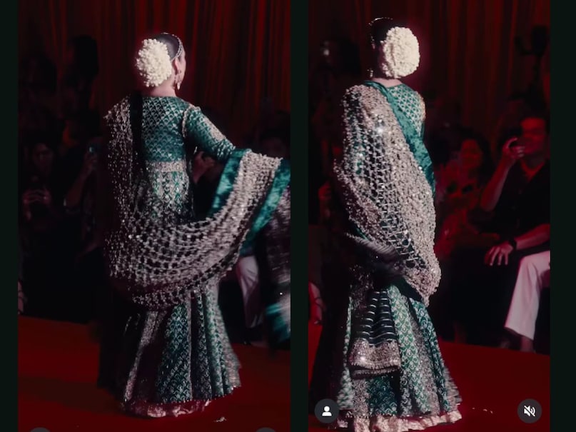 अनारकली के साथ उन्होंने मैचिंग कलीदार घाघरा पहना, जिसमें हल्के और गहरे हरे रंग का मेल एकदम परफेक्ट लग रहा था. हर कली पर गोल्डन सितारों से डिटेलिंग की गई थी. वहीं सिल्वर स्कर्ट का अटैच डिजाइन इसे रिच और ग्रैंड टच दे रहा था. पूरा आउटफिट एकदम रॉयल लग रहा था, मानो किसी राजघराने की महारानी रैंप पर उतरी हों.