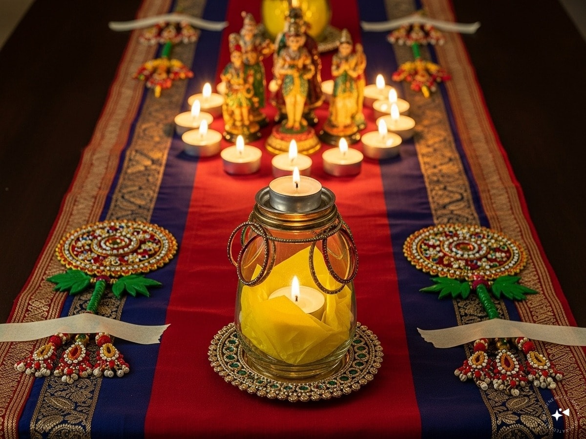 पुरानी साड़ी या दुपट्टे को टेबल रनर की तरह इस्तेमाल करें. इसके दोनों ओर तोरन लगाएं और सेलोटेप से फिक्स करें ताकि वो अपनी जगह से ना हटे. बीच में कुछ पुराने शोपीस रखें और उनके आसपास टी लाइट्स या छोटे दीयों से सजावट करें. एक खास DIY के लिए लें एक ग्लास, उसमें पीली सेलोफिन शीट डालें, उसके ऊपर टी लाइट रखें, फिर बैंगल्स से सजाएं और सबसे ऊपर एक टी लाइट होल्डर रखें. ये मिनी लैम्प्स देखने में बहुत सुंदर लगते हैं और सबसे अच्छी बात – ये एकदम घर के सामान से बनते हैं.