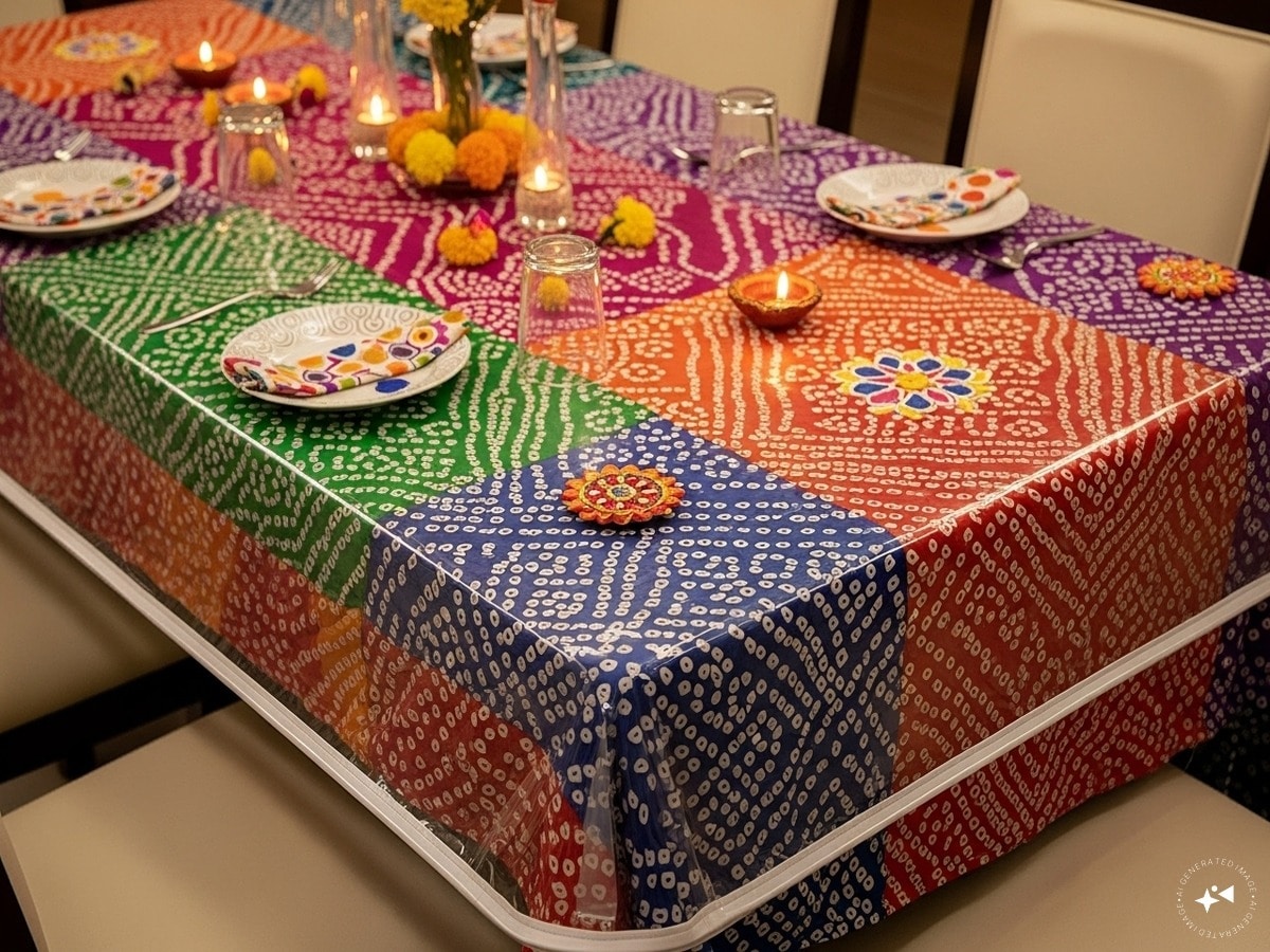 दिवाली पर डाइनिंग या सेंटर टेबल को भी सजाना जरूरी होता है. लेकिन बहुत लोग चिंता करते हैं कि गेस्ट आने पर टेबल कवर गंदा ना हो जाए. इसके लिए एक शानदार तरीका है – टेबल कवर के ऊपर ट्रांसपेरेंट प्लास्टिक कवर डालना. इससे लुक भी बना रहता है और कोई दाग-धब्बे की चिंता भी नहीं रहती. पुराने दुपट्टे, खासकर बंधेज वाले, को टेबल रनर की तरह यूज किया जाए तो रंग-बिरंगा असर आता है.