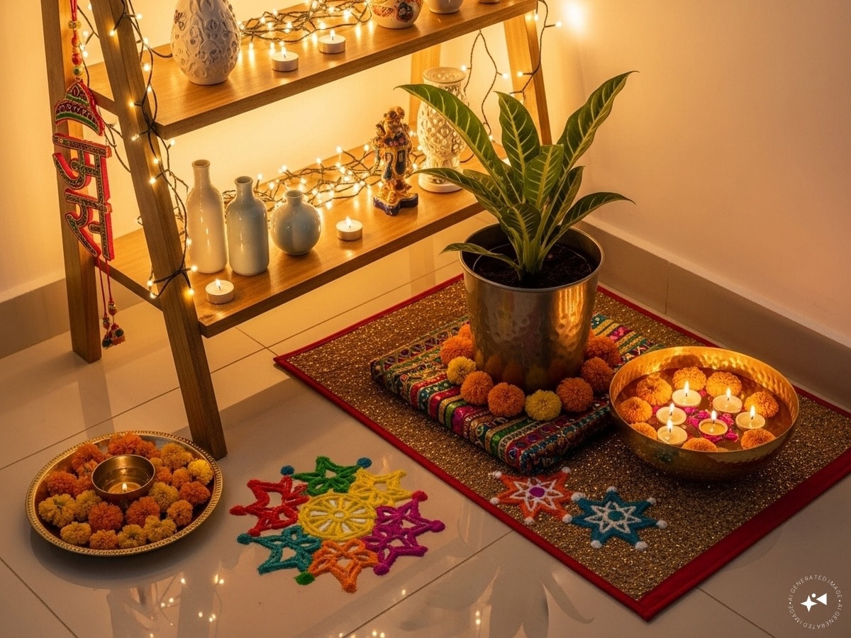 अगर आपके पास लकड़ी की शेल्फ है तो उसके पीछे स्ट्रिंग लाइट्स लगाएं और साइड में तोरन चिपका दें. फिर हल्के डेकोरेटिव पीस और टी लाइट्स रख दें.